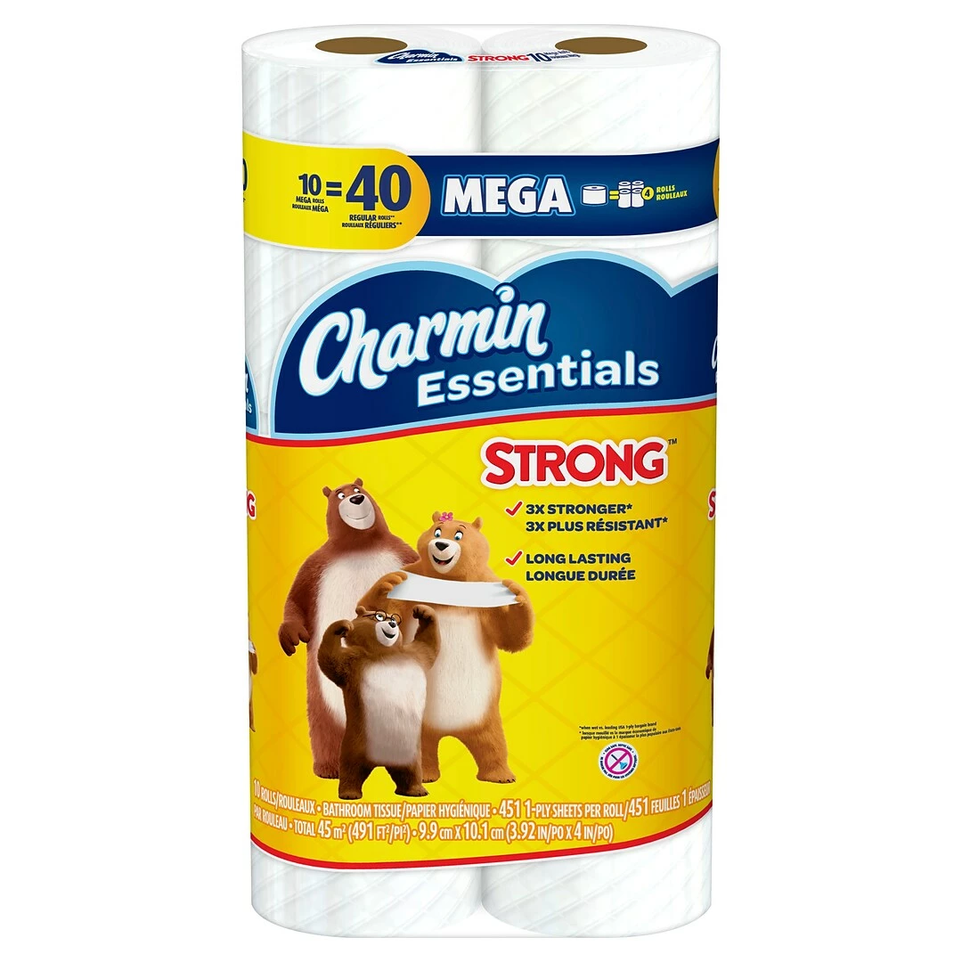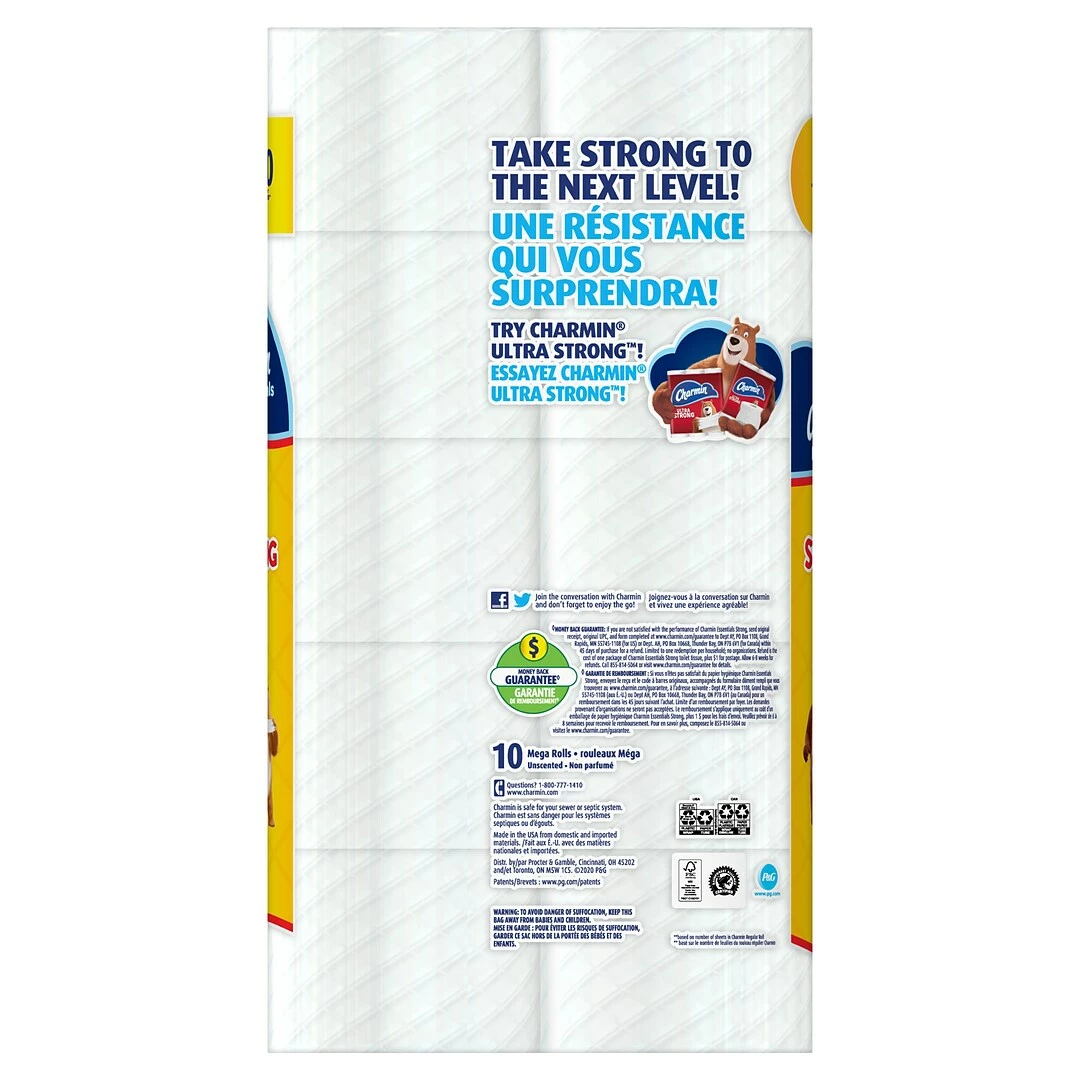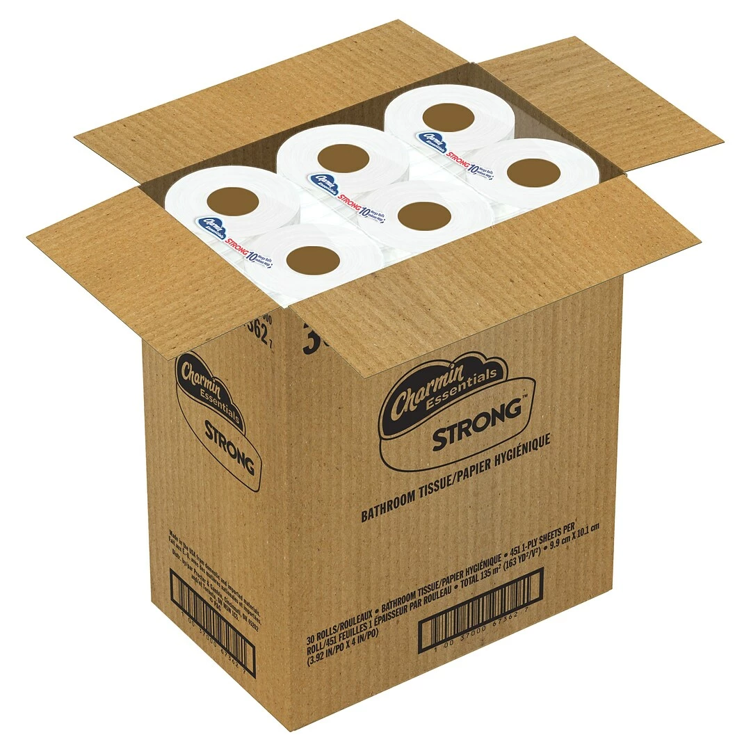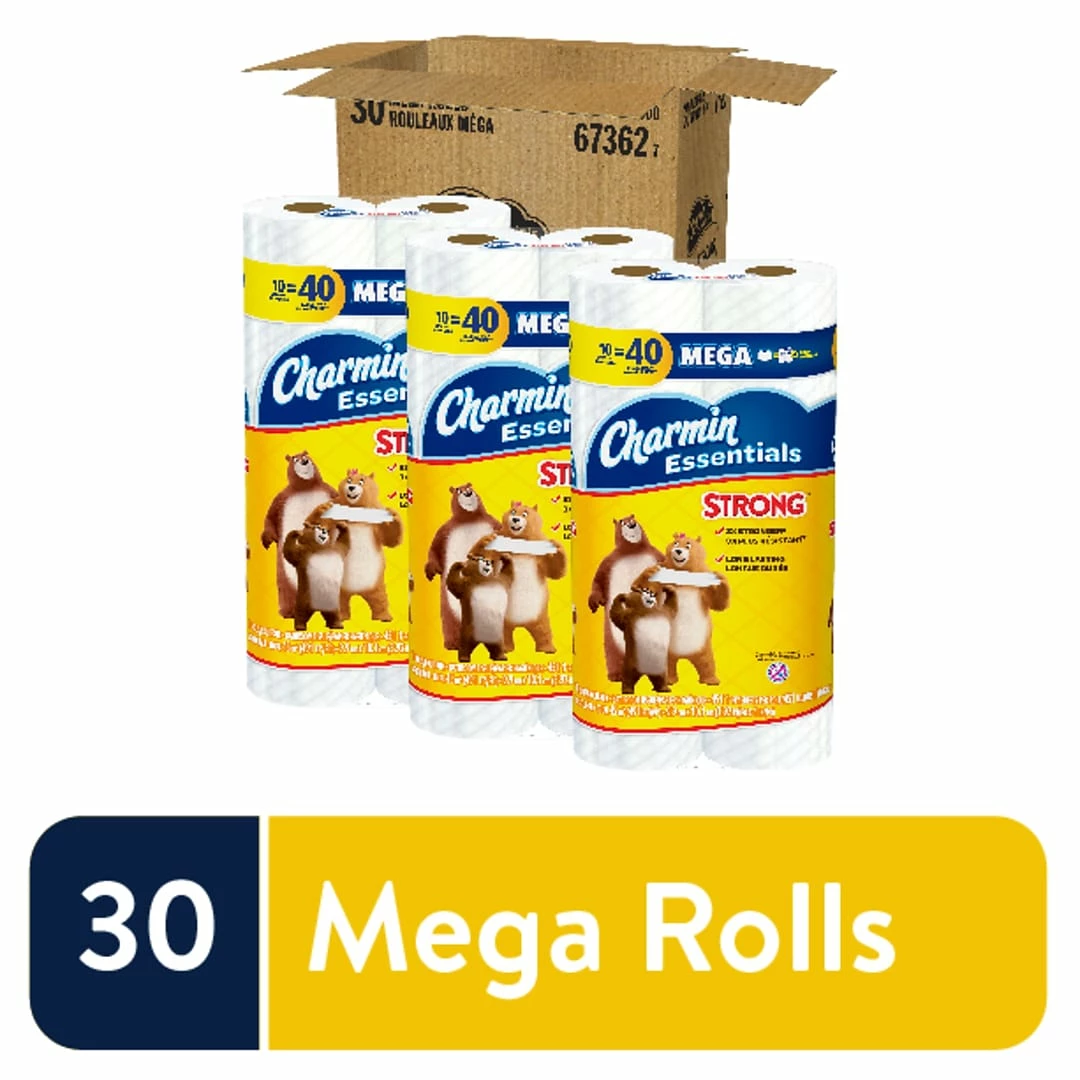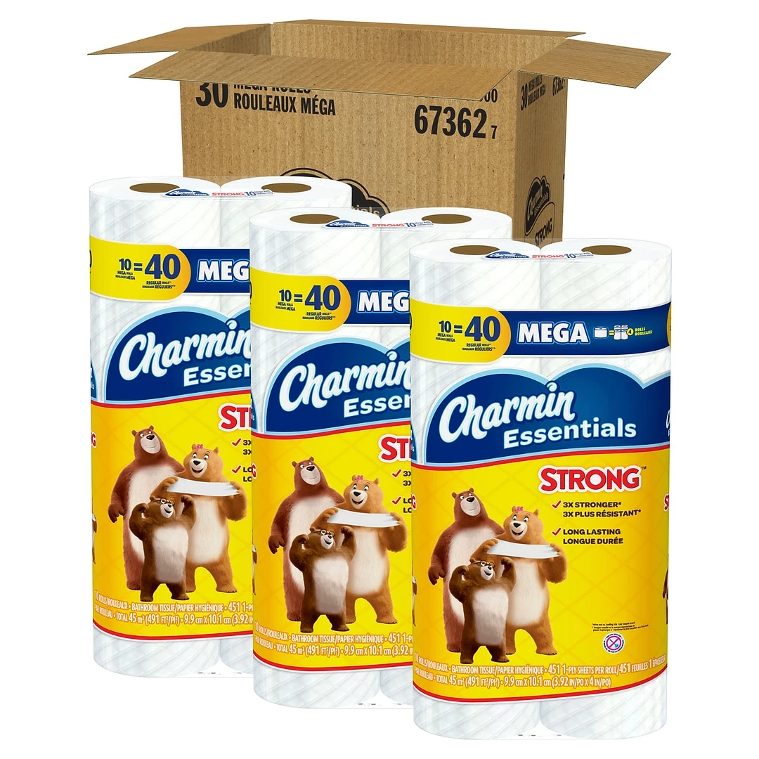 Pack contains 30 Mega Rolls (451 sheets per roll) of Charmin Essentials Strong toilet paper