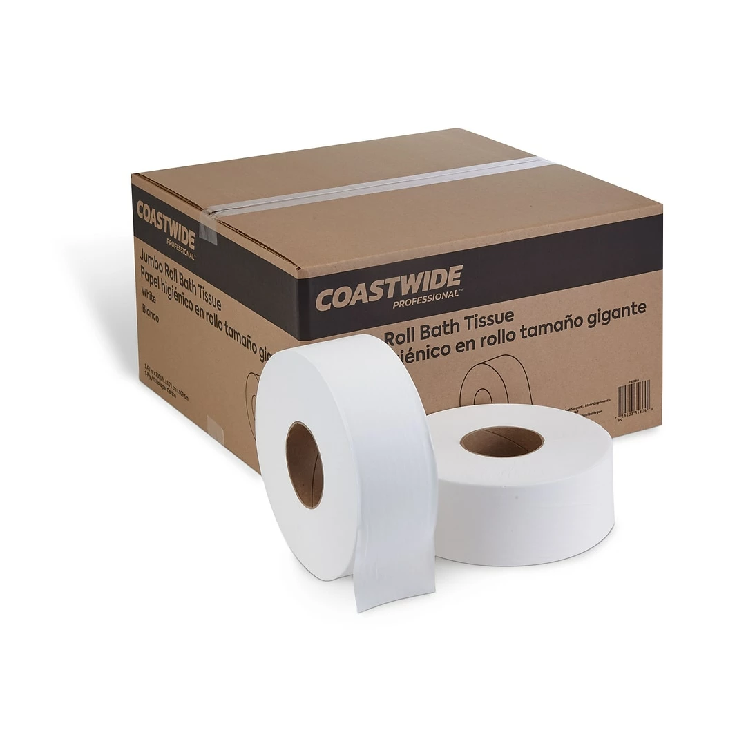 Reduce maintenance time and run-outs with these Coastwide Professional™ jumbo bath tissue rolls. They fit most universal jumbo roll tissue dispensers. Each 1-ply Coastwide Professional™ jumbo tissue roll is 2000 feet long. This soft and absorbent bath tissue is an affordable option for high-traffic restrooms, such as commercial buildings and public spaces.