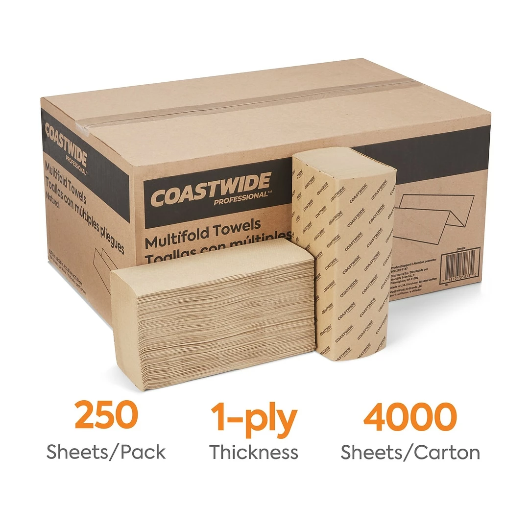 Designed for use in commercial workplaces and public restrooms, these Coastwide Professional™ one-ply paper towels fit neatly into dispensers for convenient access. Simply remove the outer wrapping on each bundle and place the towels in your dispenser. Add these sturdy, absorbent sheets in breakrooms and dining areas to clean up spills, or keep them in the office’s restrooms to promote cleanliness in the workplace. Each package contains 4,000 folded paper towels, which ensures a plentiful supply for your office. This reduces the amount of time spent reordering supplies, so you can focus on more important day-to-day operations.