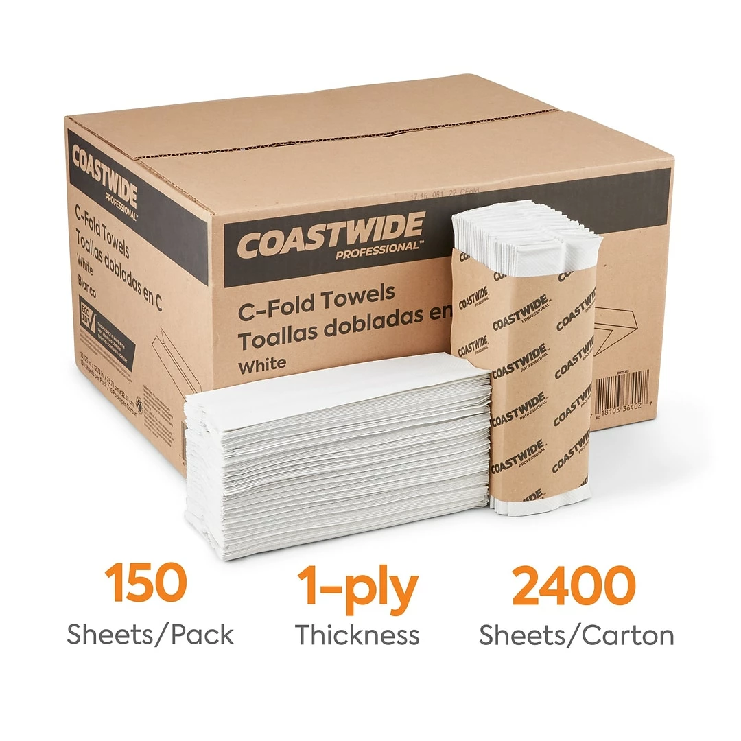 Make an eco-friendly choice with these chlorine-free Coastwide Professional™ C-fold paper towels, made of 100% recycled fibers with a minimum of 80% post-consumer content. The one-ply construction offers absorbency without adding extra paper waste, and the compact fold fits neatly in any standard paper towel dispensers. The bulk packaging provides 2400 towels per carton for conveniently refilling all your restroom dispensers, each pack is conveniently bundled into 150 paper towels, making it easy to distribute them to different areas of your office building. Coastwide Professional™ C-fold paper towels feature a white embossed design for a clean, professional appearance.