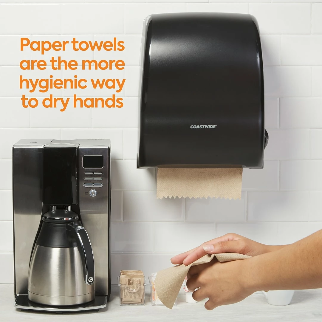 Make an eco-friendly choice with these chlorine-free Coastwide Professional™ hardwound paper towels. These one-ply paper towels are strong and durable for wiping up spills or cleaning fluids, but are soft for drying hands on a frequent daily basis. Each roll in this 12-carton features 350 feet of natural one-ply paper towels, ideal for use in restrooms or anywhere spills occur. An environmentally-friendly choice, these Green Seal-certified towels contain 100 percent recycled fibers. These Coastwide Professional™ natural hardwound paper towel rolls are designed to fit most universal towel dispensers.