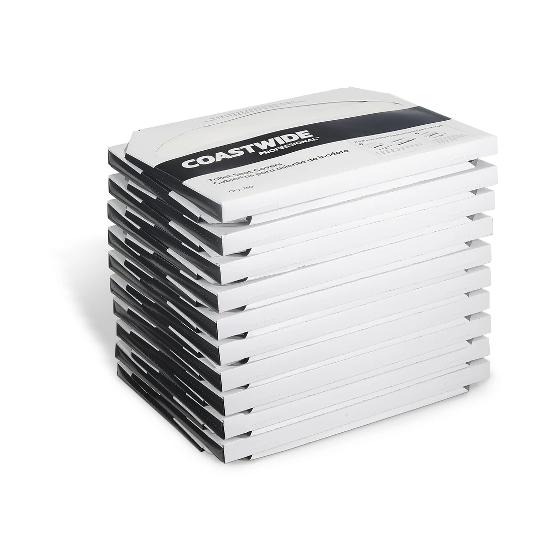 Provide a hygienic barrier for visitors and staff with these half-fold paper toilet seat covers. With 20 packs of 250 covers each, this carton makes it simple to keep maintenance carts and closets stocked and reduces the need for frequent refills. These Coastwide Professional toilet seat covers work with compatible Coastwide Professional dispensers and feature a flushable design that’s safe for most septic systems.