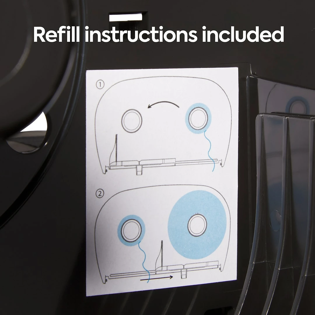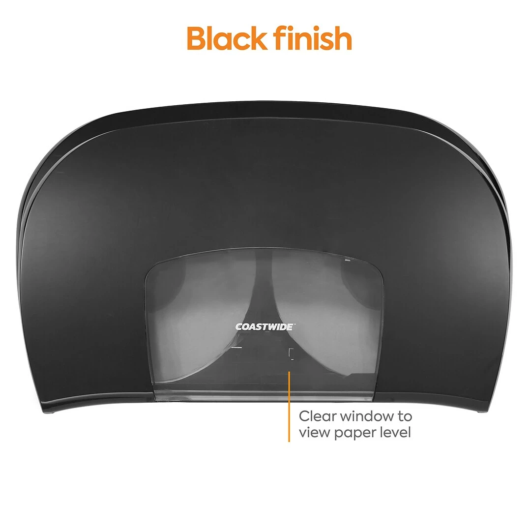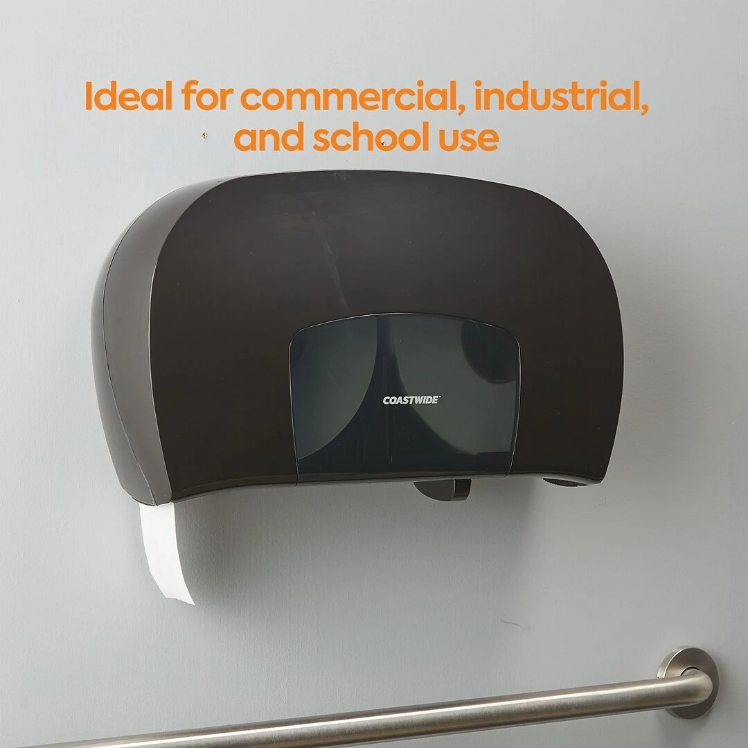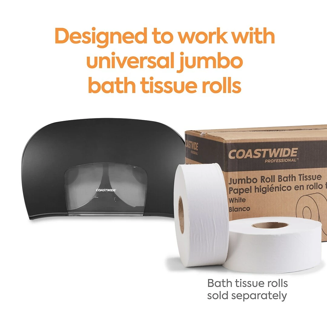 Store two rolls of toilet paper simultaneously for reduced maintenance with this black jumbo bath tissue dispenser. Compatibility with various 9″ jumbo-sized rolls with a 3.5″ core offers easy replacement, and the wall-mounted design allows flexible placement. This Coastwide Professional™ twin jumbo bath tissue dispenser features a black finish for a modern, professional look, while the included installation hardware and dispenser key allow for simple setup and quick access.