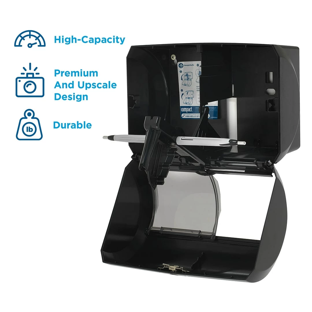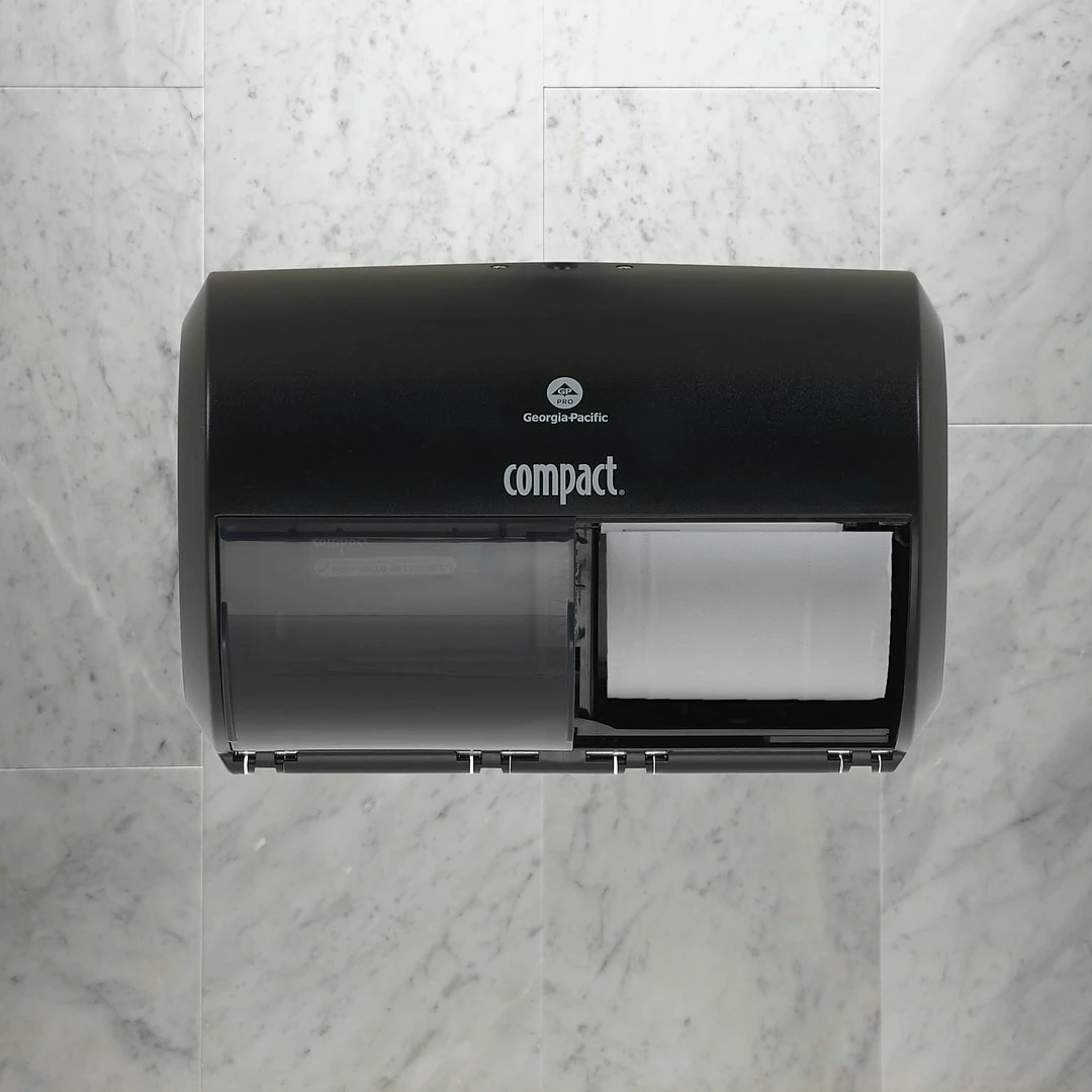 Compact coreless toilet paper dispensing systems answer key needs for facilities managers when it comes to toilet paper for the restrooms. These high capacity systems help you avoid running out between service intervals and help reduce maintenance time typically spent changing out conventional toilet paper rolls. These systems save up to 95% in packaging waste compared to GP PRO’s standard roll toilet paper by eliminating stub-rolls, corrugate cores, paper roll wraps and the outer cardboard shipping case. And because the Compact case has a smaller footprint, it requires less storage space. Compact coreless toilet paper dispensers are designed to give the facility high capacity for continuous service. GP PRO is a division of Georgia-Pacific consumer products. We deliver well-designed, durable and easy-to-maintain professional solutions to meet the handwashing and cleaning needs for a range of business applications.