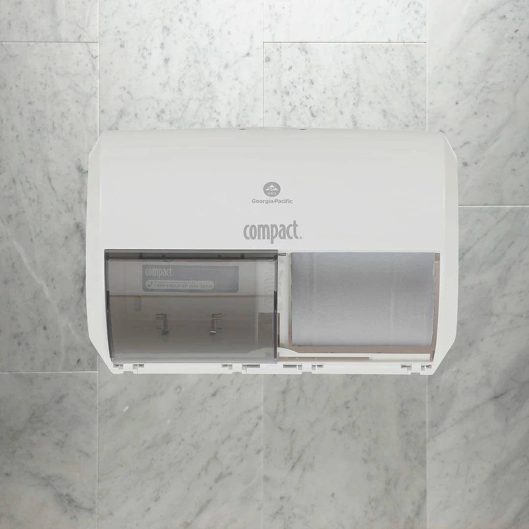Compact® coreless toilet paper dispensing systems answer key needs for facilities managers when it comes to toilet paper for the restrooms. These high capacity systems help you avoid running out between service intervals and help reduce maintenance time typically spent changing out conventional toilet paper rolls. These systems save up to 95% in packaging waste compared to GP PRO’s standard roll toilet paper by eliminating stub-rolls, corrugate cores, paper roll wraps and the outer cardboard shipping case. And because the Compact® case has a smaller footprint, it requires less storage space. Compact® coreless toilet paper dispensers are designed to give the facility high capacity for continuous service. GP PRO is a division of Georgia-Pacific Consumer Products. We deliver well-designed, durable and easy-to-maintain professional solutions to meet the handwashing and cleaning needs for a range of business applications.