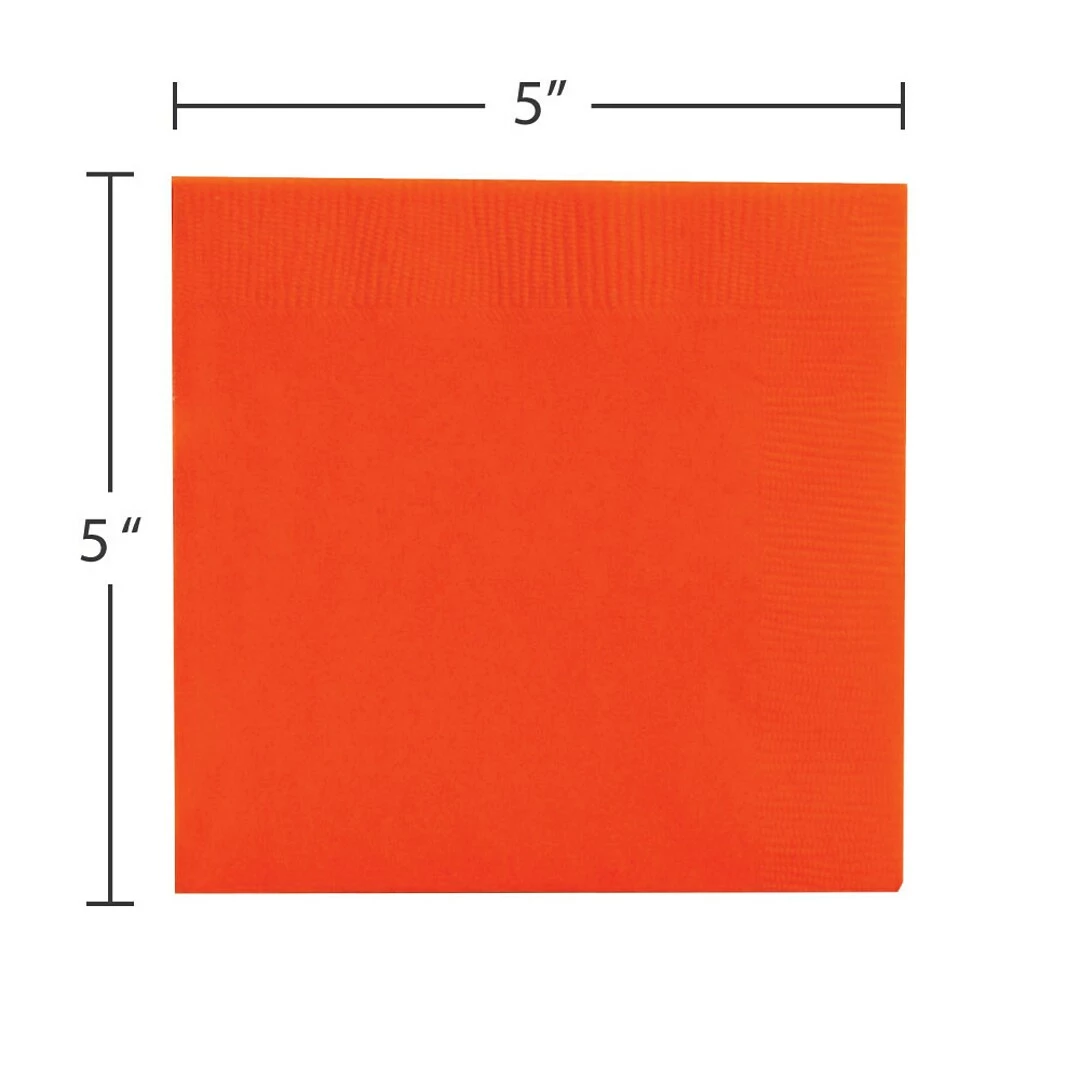 JAM Paper Orange Small Beverage Napkins measure 5 x 5 inches in size and are made from smooth and durable paper. A total of 40 napkins are contained in this pack. Each one features a bright and vivid pumpkin orange color! Measuring 5 inches on each side, these napkins are perfectly square. This shape and size makes them great for placing under the glasses and cups on your table to soak up condensation. Their color makes them great for use at Halloween parties, Thanksgiving dinners, fall festivals, birthdays, summer parties, picnics, and more! Complete your table setting with these practical and vibrantly colored orange beverage napkins.