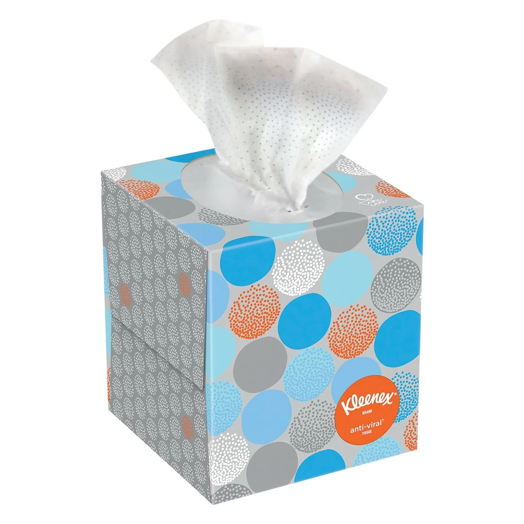 Kleenex Antiviral Facial Tissue Colds and flus are bad for business, bad for learning and, well, just generally no fun. Three-ply Kleenex Antiviral Tissue features a moisture-activated middle layer that kills 99. 9% of cold and flu viruses in the tissue within 15 seconds. Toss the face tissue, toss the germs. Simple! Stop Germs Fast Did you know that as much of 80% of infectious illnesses are spread through hands and surfaces? As part of a solution, Kleenex Anti Viral Tissues kill 99. 9% of cold and flu viruses. The 3-ply tissue’s moisture-activated middle layer is virucidal in just 15 minutes. Exceptional softness and premium feel encourage tissue use, helping you create a healthier environment. Germs Be Gone The Kleenex Anti-viral Facial Tissue is virucidal against Influenza A and B (which cause the flu), Respiratory Syncytial Virus (RSV – the leading cause of lower respiratory infections in children) and Rhinoviruses Type 1A and 2 (rhinoviruses are the leading cause of the common cold). Stocking schools and businesses with a Kleenex facial tissue cube is a smart idea.
