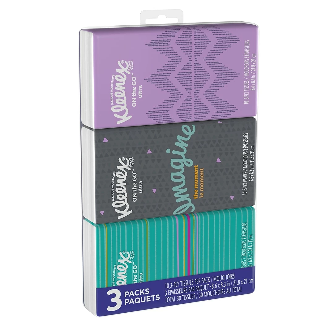 Kleenex Go Pack 3-Ply facial tissue is ideal for colds, allergies and sensitive noses. Tissue features durable construction that helps to reduce the spread of airborne illnesses, sold as 10 sheets per pack.