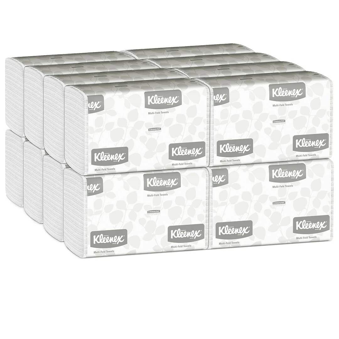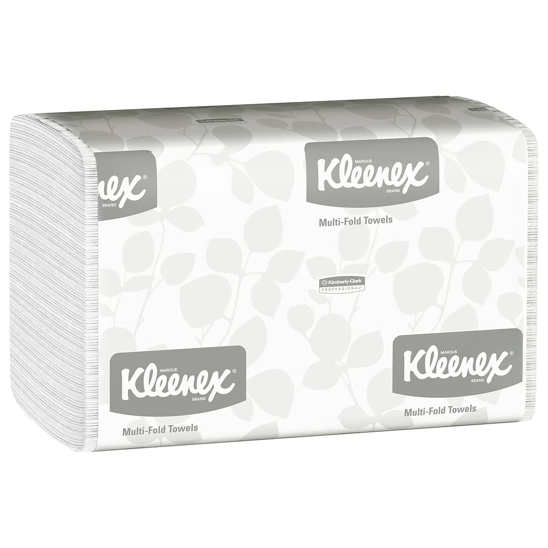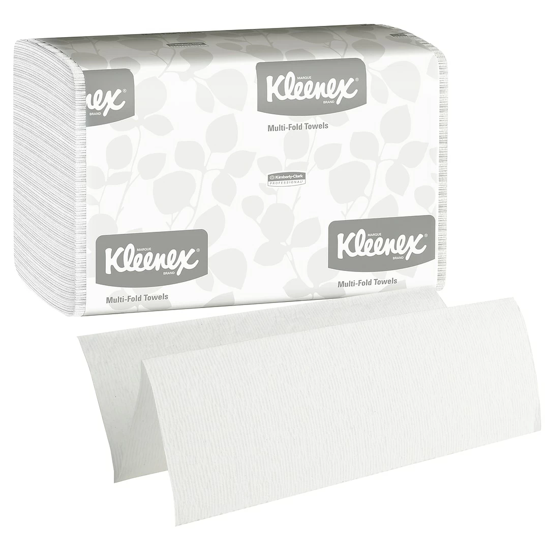 Premium Paper Towels are Good for BusinessCreating a hygienic, high-end bathroom experience is a must for your business. Kleenex multifold towels measure 9.2x 9.4 inch / 23.4 cm x 23.9 cm, and their Absorbency Pockets are specifically designed to be extra-absorbent (for less waste) to provide excellent drying. These paper hand towels dispense one at a time and fit into most any universal multifold paper towel dispenser.CleanDid you know that paper towels can remove up to 77% of bacteria from a personās hands? These absorbent, soft Kleenex Multifold Paper Towels are a smart way to give bathroom visitors just what they need to stay clean after a restroom visit.Your image is important, especially for your business. Providing top-quality Kleenex Multifold Paper Towels in your office washroom and kitchen lets your employees and guests know that you care enough to offer the very best experience. Each paper towel is 9.2 x 9.4 inches (unfolded) of soft, absorbent material, so users will use fewer paper towels and waste less. Their fold is designed to dispense one at a time, while bringing the next towel forward for another user. They’re designed be used with universal multi-fold towel dispensers, giving you maintenance flexibility. These Kleenex tri fold paper towels meet EPA minimum standards, are FSC and Eco Logo certified and feature recyclable packaging, so you can choose confidently.Help soothe sensitive skin with Kleenex Lotion Facial Tissues infused with pure aloe and vitamin E. Pair with Kleenex Brand moisturizing soaps and hand sanitizers. Kleenex Antiviral Facial Tissues help to stop germs in their tracks. People know they can depend on the Kleenex Brand, so itās no surprise they prefer the brand they know for sneezes, watery eyes or makeup fixes on the go! Soft, durable tissues; Moisturizing skin care; Thick and absorbent paper towels, all from a brand you trust.