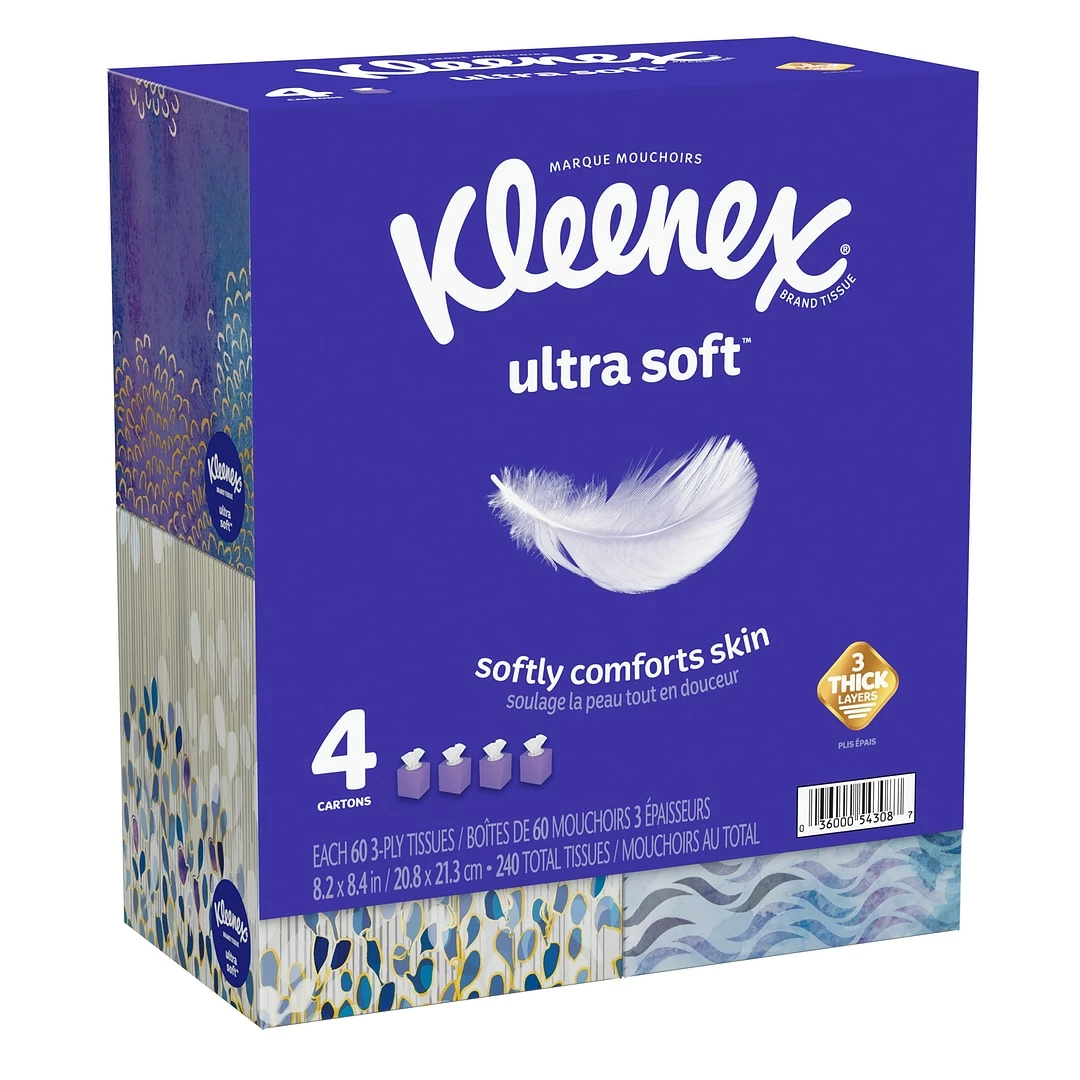 Keep your family healthy and help reduce sickness during cold and flu season with this pack of soft facial tissue. Kleenex® Ultra Soft ™ Tissues are indulgent 3-ply tissues that are America’s softest ultra soft tissue* (among national brands). Dependable strength with ultimate softness* (among national brands) make these the best everyday tissues you can get. These Kleenex Ultra Soft facial tissues have 60 sheets per box for long-lasting use.