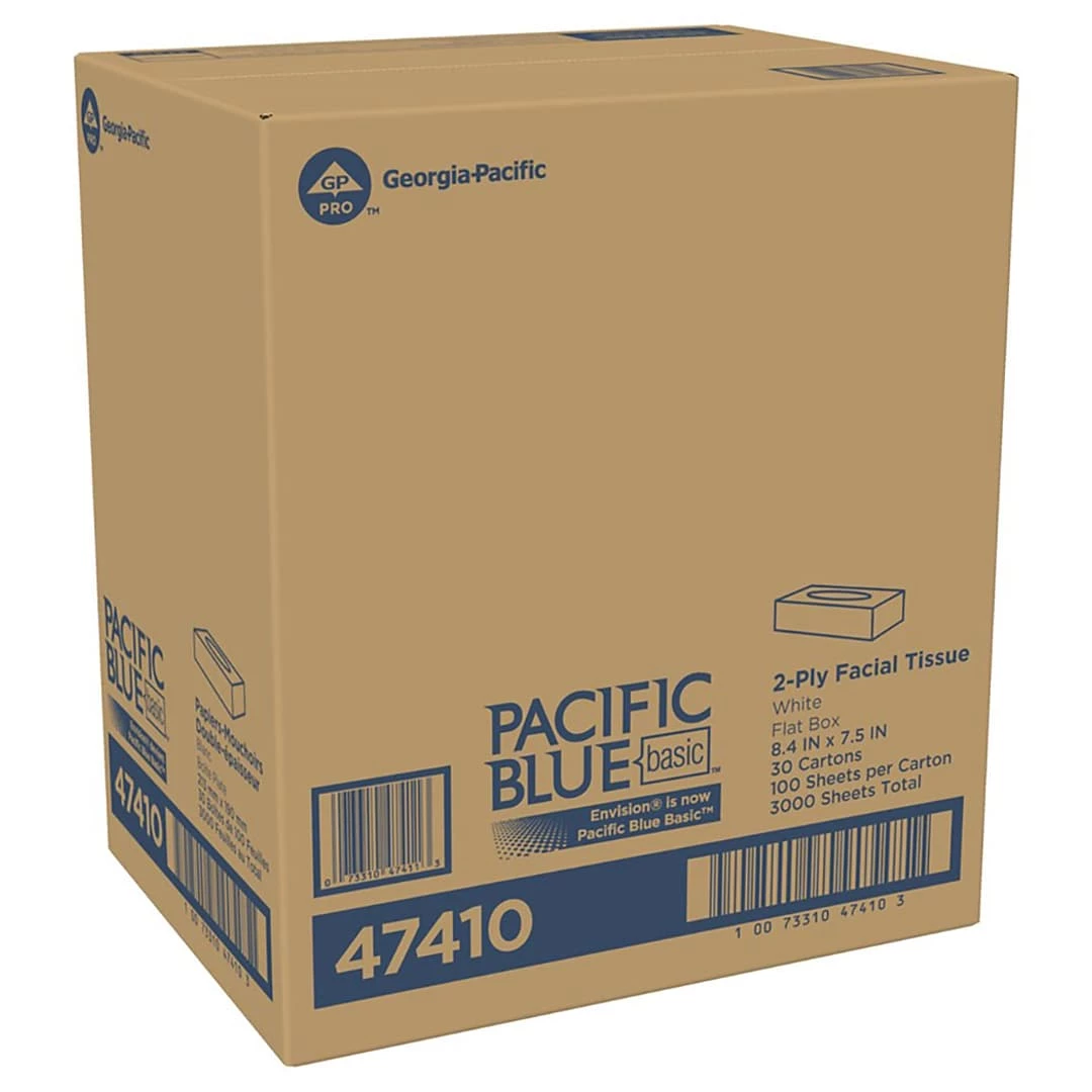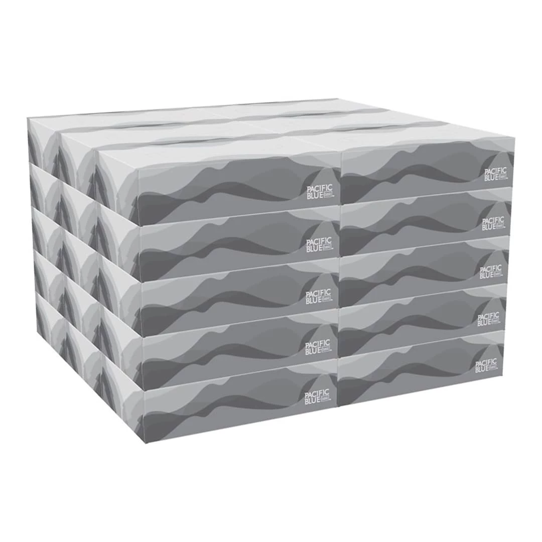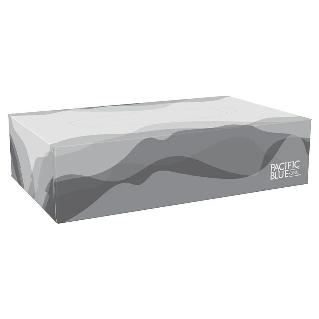Pacific Blue Basic 2-ply facial tissues are soft, gentle and hypoallergenic, making them ideal for sensitive skin and use with runny noses due to allergies. Their smooth surface protects against chafing and irritation, even with extended use. Although lightweight, these 2-ply tissues are durable and absorbent enough to handle a variety of everyday messes. Made of 100% recycled material and contained in a fully recyclable cardboard box, these tissues are environmentally friendly. This highly economical pack of 30 boxes saves you money, giving you more tissues at a lesser cost.