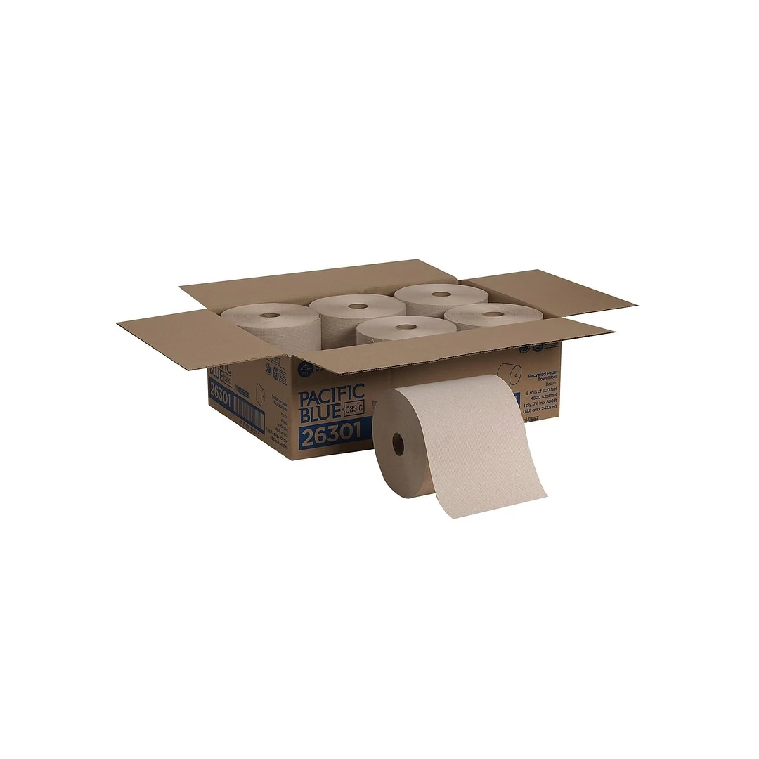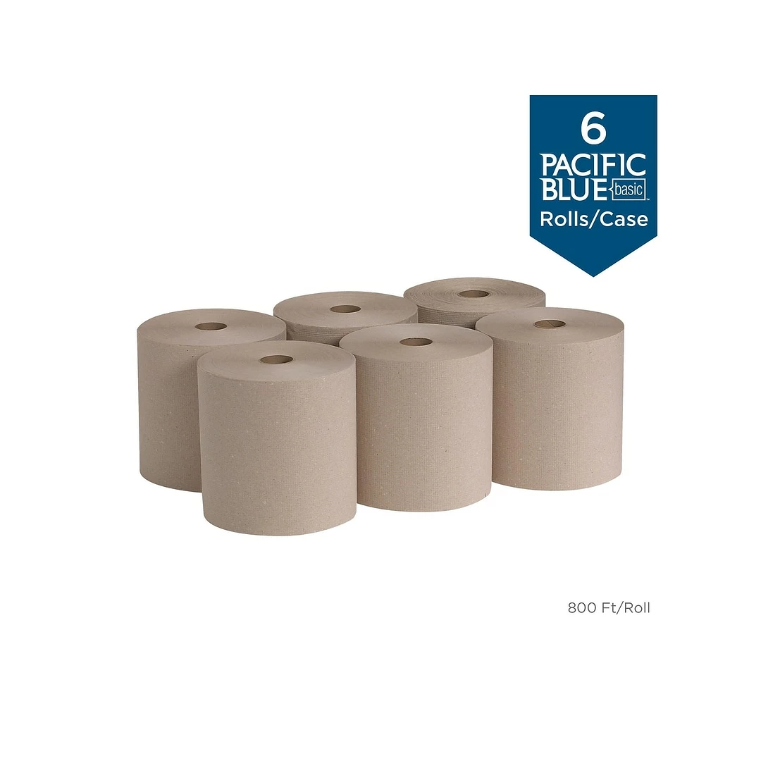 Designed to fit into a wide range of universal hardwound roll towel dispensers, Pacific Blue Basic Recycled Hardwound Paper Towel Rolls are high capacity, economical, everyday roll towels that may help you keep costs under control. Low per-unit costs makes these bulk paper towels the affordable choice for high-traffic areas such as washrooms in government and public facilities, office buildings, foodservice facilities and lodging.