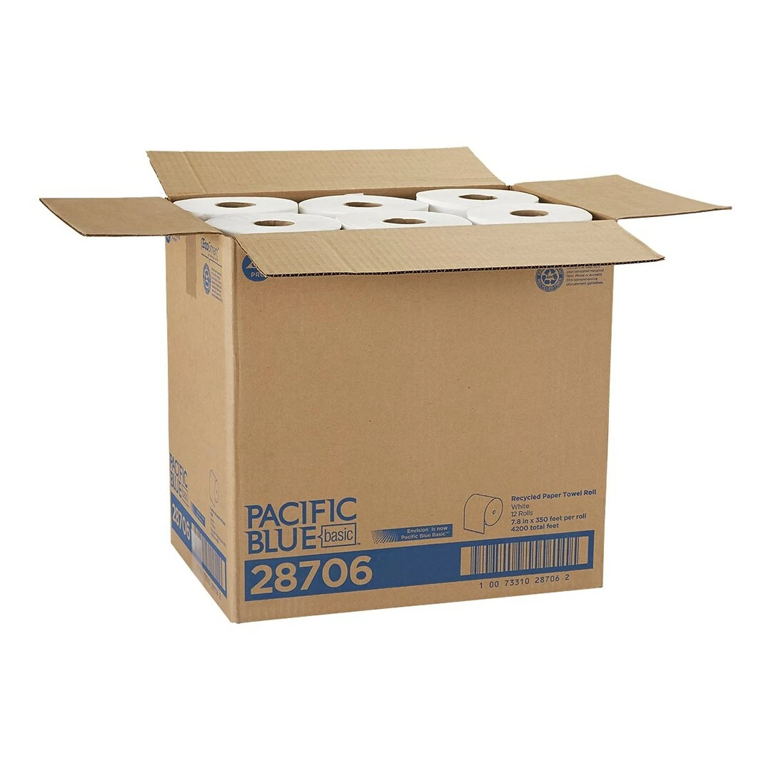 Stock office kitchens, break rooms, restrooms, and other shared spaces with these recycled paper towel rolls. Durable yet absorbent construction makes quick work of spills, stains, and splashes, while the white color offers a clean look. Created to fit with a range of universal dispensing systems, these Pacific Blue Basic paper rolls make a versatile option for your business needs.