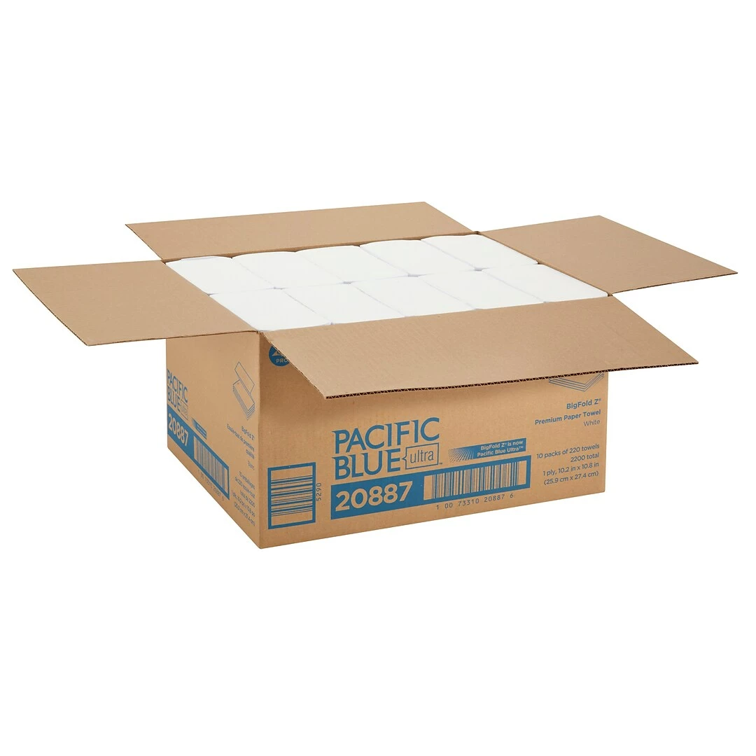 Pacific Blue Ultra BigFold Z premium paper towels have a decorative emboss that shouts quality, hand-performance, and hand comfort. They fit into existing C-fold and multifold dispensers (no adapter required!) to provide a premium, cost-saving C-fold paper towel substitute. This commercial paper towel’s unique fold allows for reliable, touchless dispensing of one fully-opened, absorbent towel, which reduces the number of bulk paper towels used as well as the risk of cross-contamination. Pacific Blue Ultra BigFold Z premium paper Towels outperform C-fold towels by reducing waste and decreasing costs for an economical solution you can count on.40% more Pacific Blue Ultra BigFold Z towels fit in a dispenser, compared to traditional C-fold towels, so they require fewer refills. In addition, the interfold design cannot be loaded incorrectly, which helps prevent misfeeds and helps reduce maintenance time.Pacific Blue Ultra BigFold Z Premium Paper Towels fit most universal C-Fold and Combi-Fold dispensers, including our C-Fold/M-Fold Paper Towel Dispensers (56630/01 or 56601) or our Combi-Fold Paper Towel Dispenser (56650/01); or use our Countertop C-Fold/M-Fold Paper Towel Dispenser (56640) on the counter by a sink.Universal Folded Paper Towels are an essential supply for a wide range of professional, away-from-home facilities. They come in white and brown colors, with recycled content options available, and different fold configurations including C-Fold, Z-Fold, M-Fold and S-Fold.They are typically dispensed from ‘universal folded towel’ dispensers that are mounted on the wall and available from towel manufacturers. In smaller business environments and restrooms, folded towels are sometimes ‘set out’ in an open tray or simply stacked on the side of a sink or work space.GP PRO is a division of Georgia-Pacific Consumer Products. We deliver well-designed, durable and easy-to-maintain professional solutions to meet the handwashing and cleaning needs for a range of business applications.