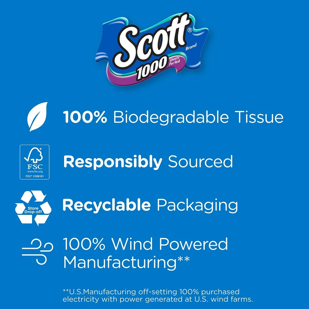 Enjoy fewer roll changes and more value with Scott 1000 toilet paper. Each roll contains 1000 durable 1-layer sheets and lasts longer than the average bath tissue roll. Scott 1000 bathroom tissue dissolves quickly, so it’s kinder to your plumbing and is sewer-safe and septic-safe. Scott 1000’s fast-acting break up makes it safe for RV or boat use as well. Get the performance you want from Scott 1000, the #1 value brand toilet paper. For a complete clean, combine Scott 1000 toilet paper with Scott Flushable Wet Wipes. Scott toilet paper is sustainably sourced from responsibly managed forests. Order Scott 1000 online in bulk and save!