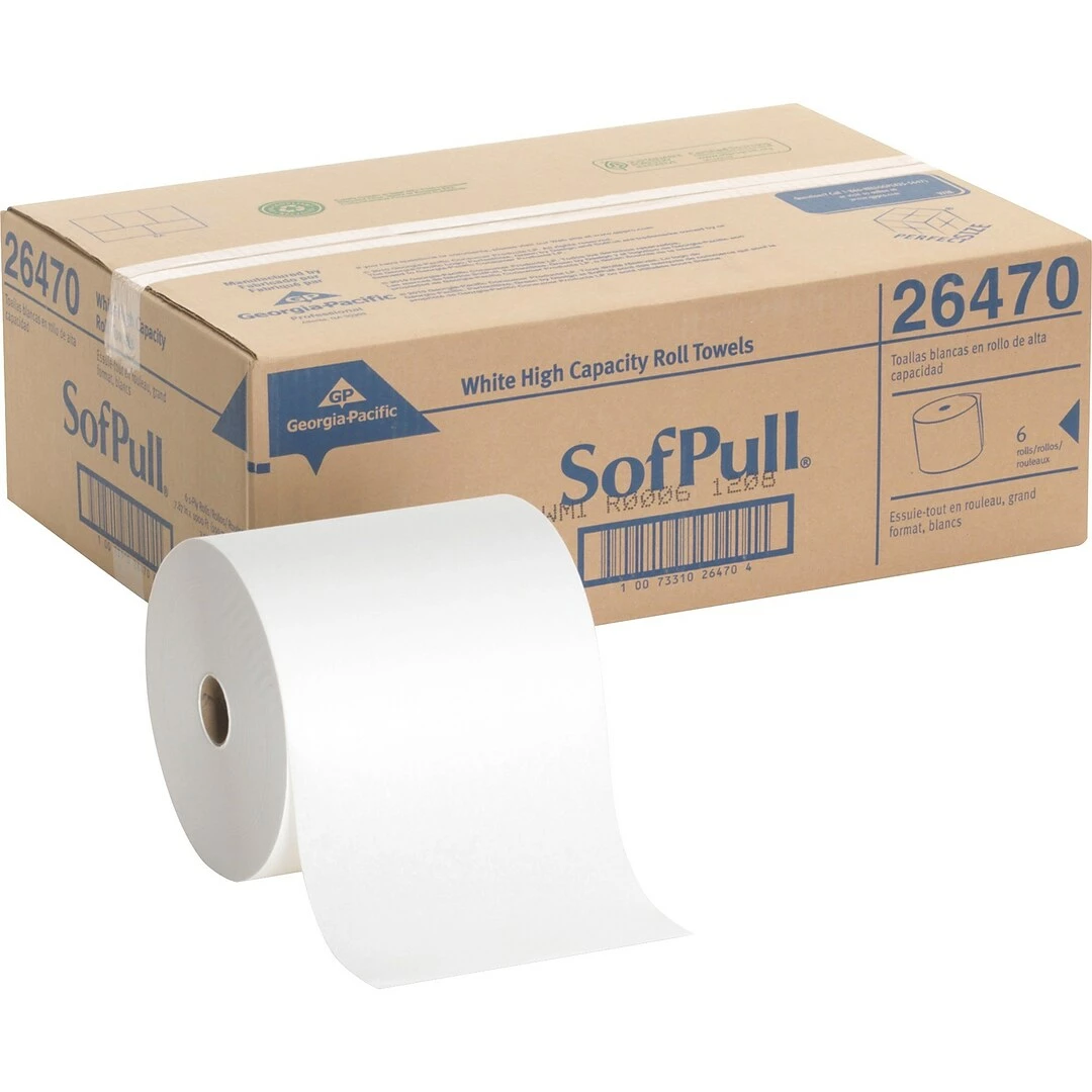 Hardwound roll towels offer the quality you expect to find in office breakrooms, doctor offices and any area where you want to make a good impression. Unique design with a plugged core makes it the perfect companion to the Georgia-Pacific SofPull mechanical touchless towel dispenser. Embossed, white, one-ply roll towels offer softness and absorbency.