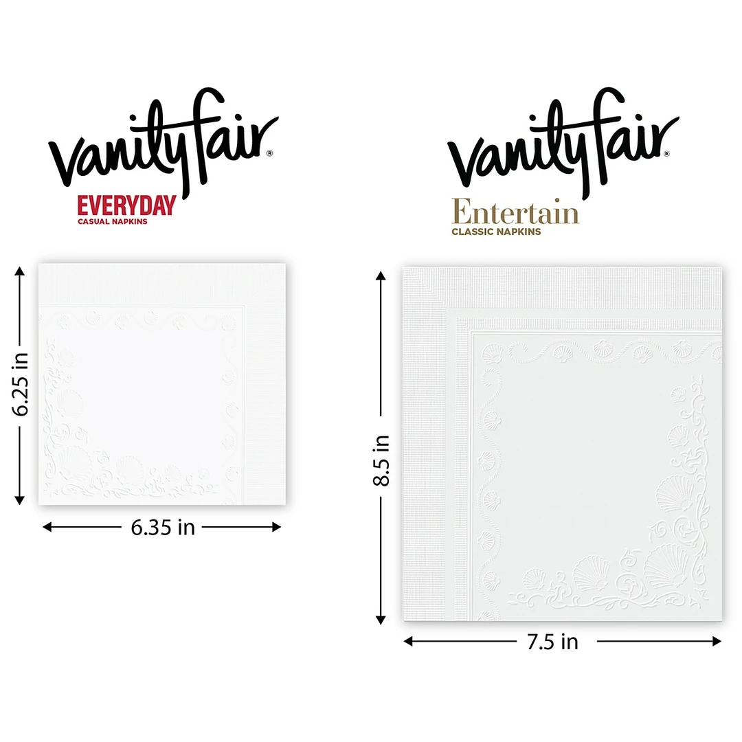 Complete any table setting with these casual paper napkins. The durable two-ply construction absorbs even the messiest spills, and the stylish embossed design adds a decorative touch to any meal. These Vanity Fair paper napkins are sold in a package of 100, which makes them ideal for large gatherings or daily use.
